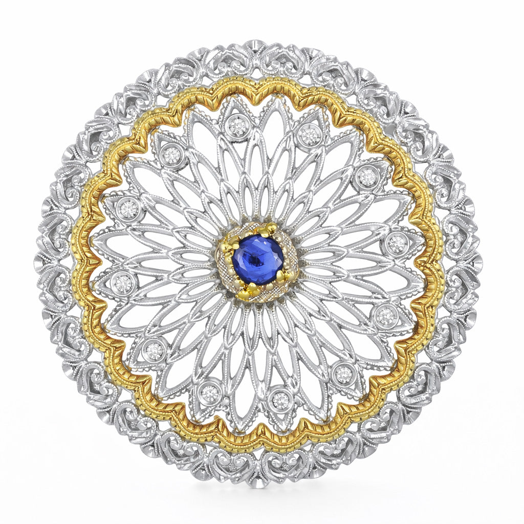 Spilla in Oro giallo ,Oro Bianco 18 carati con n 1 Zaffiro da 0.30 e n 12 Diamanti da 0.24 Ct tot