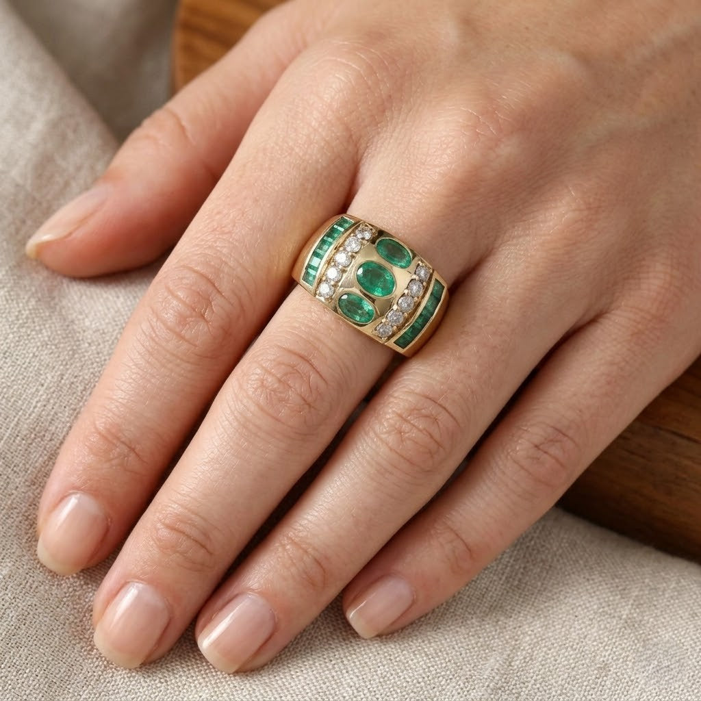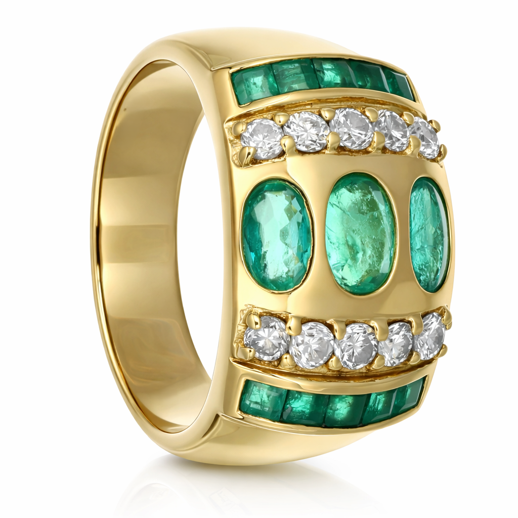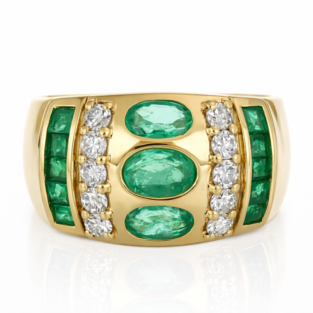 Anello in Oro giallo 18 carati con n 13 Smeraldi da 1.15 Ct tot e n 10 Diamanti da 0.30 Ct tot