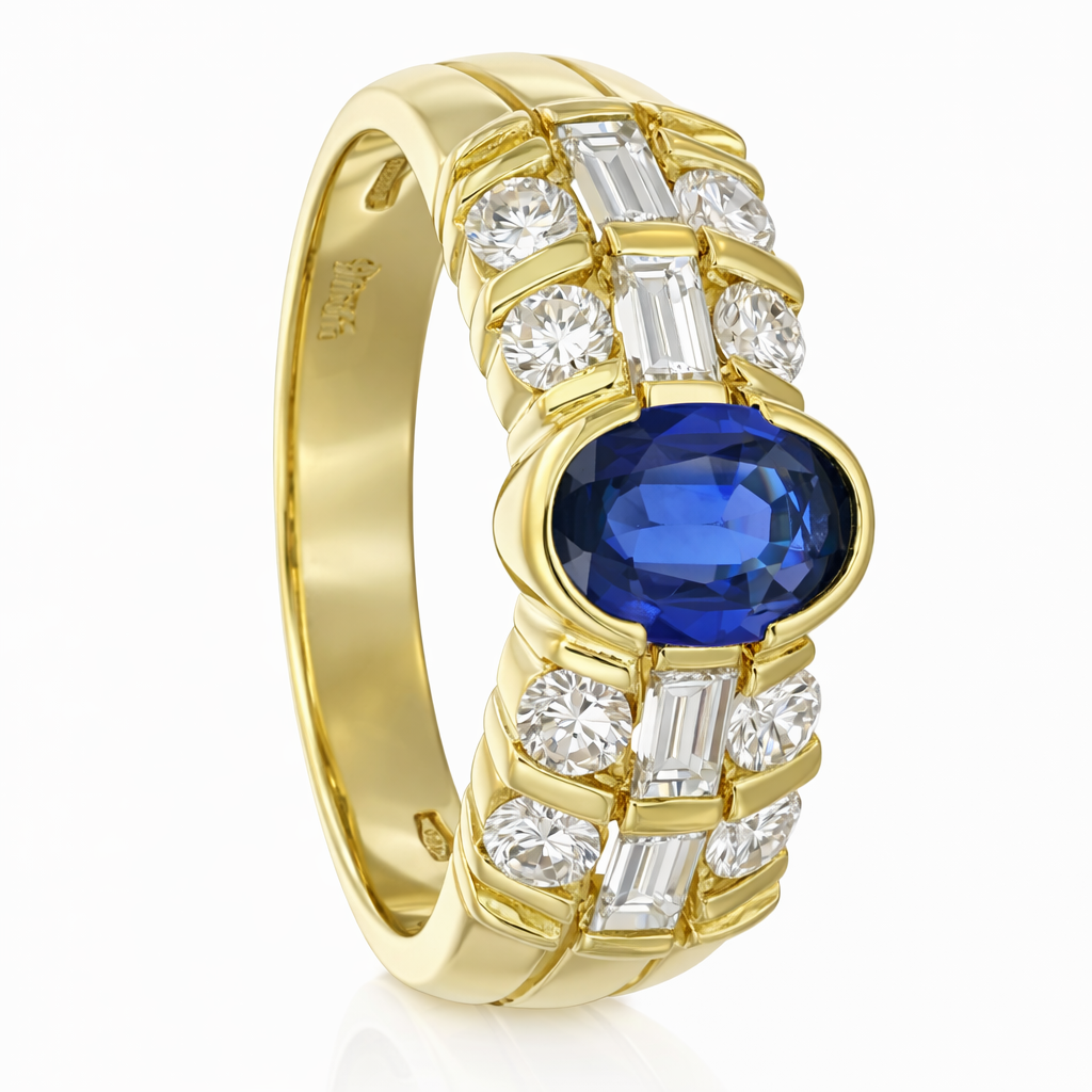 Anello in Oro giallo 18 carati con n 1 Zaffiro da 0.80 Ct e n 12 Diamanti da 0.80 Ct tot