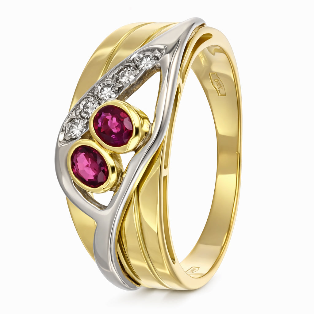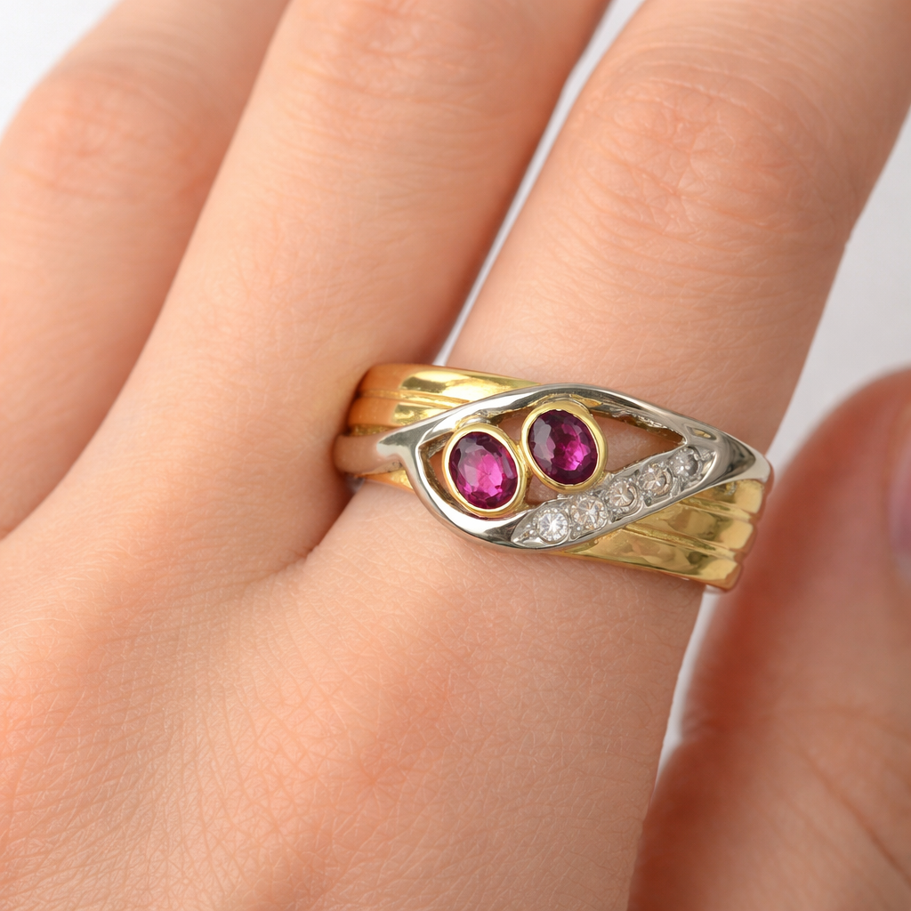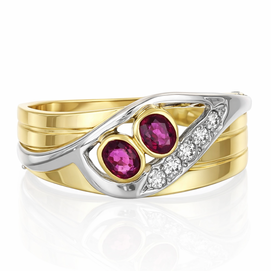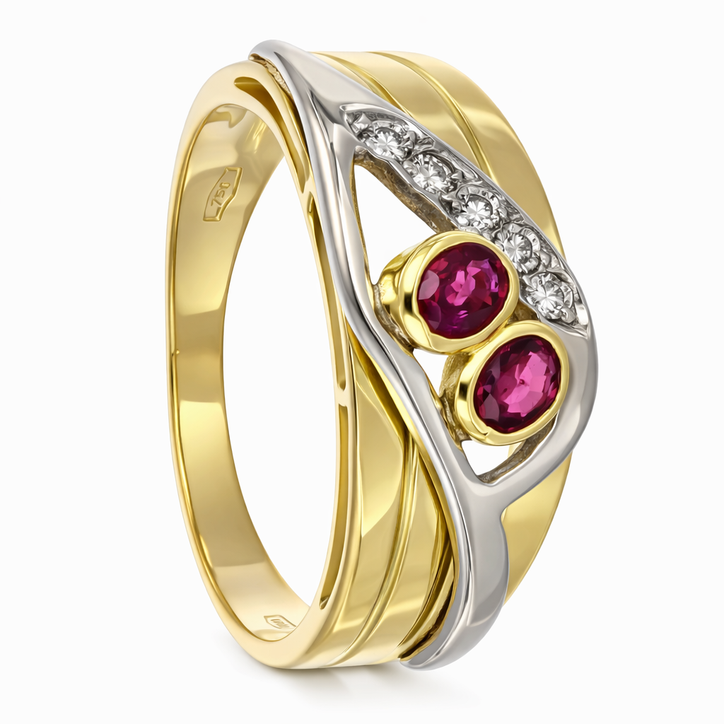 Anello in Oro giallo ,Oro Bianco 18 carati con n 2 Rubini da 0.30 Ct tot e n 5 Diamanti da 0.15 Ct tot