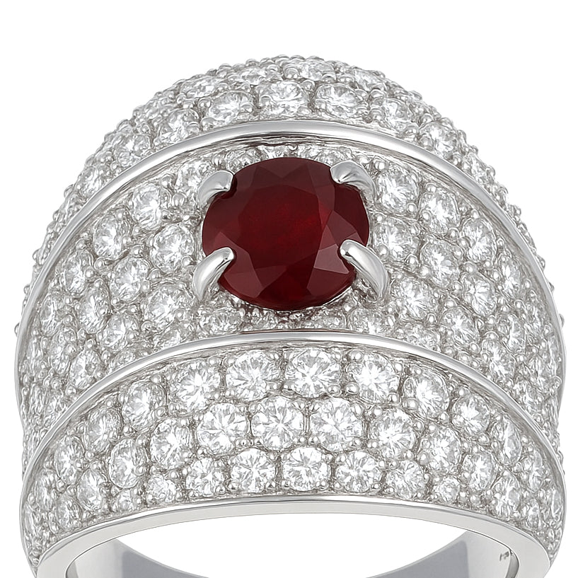Anello in oro bianco 18 carati con Rubino Pigeon Blood 1.10 Ct con certificazione GEM TECH 310562 e N. GF20070108 in 162 Diamanti 2,55 Ct tot