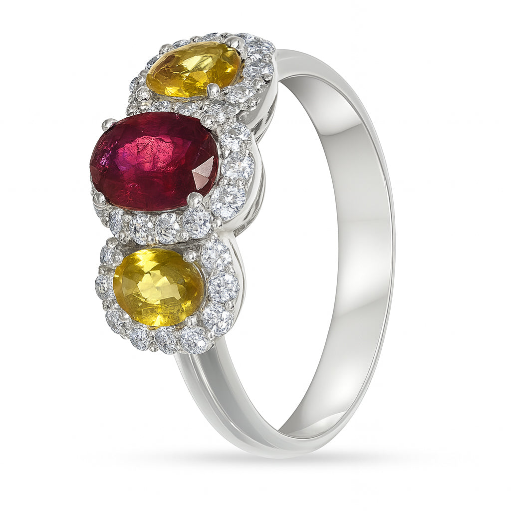 Anello in oro bianco 18 carati con n 2 Zaffiri da 0.84 Ct tot , n 1 Rubino da 1.00 Ct e n 32 Diamanti da 0.64 Ct tot
