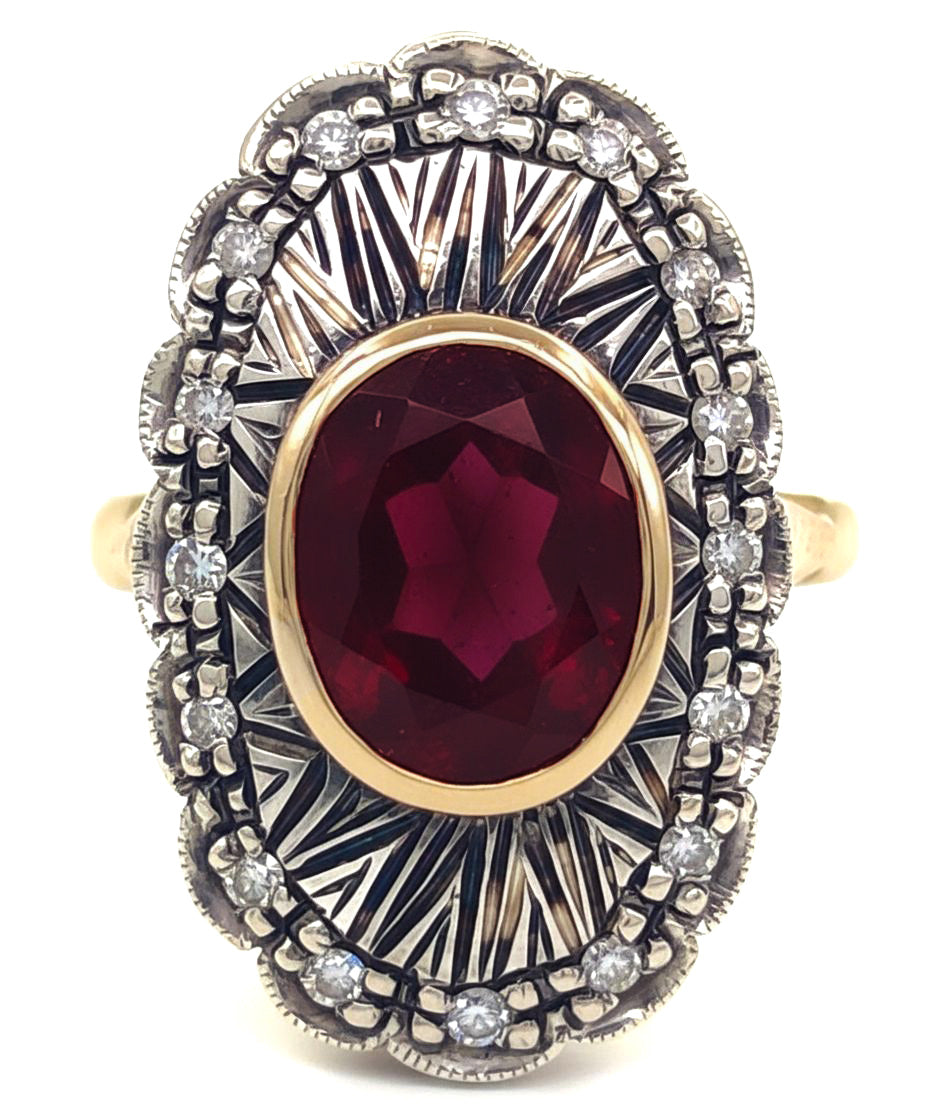 Anello in Oro giallo 18 carati e Argento 800 con Granato e Diamanti