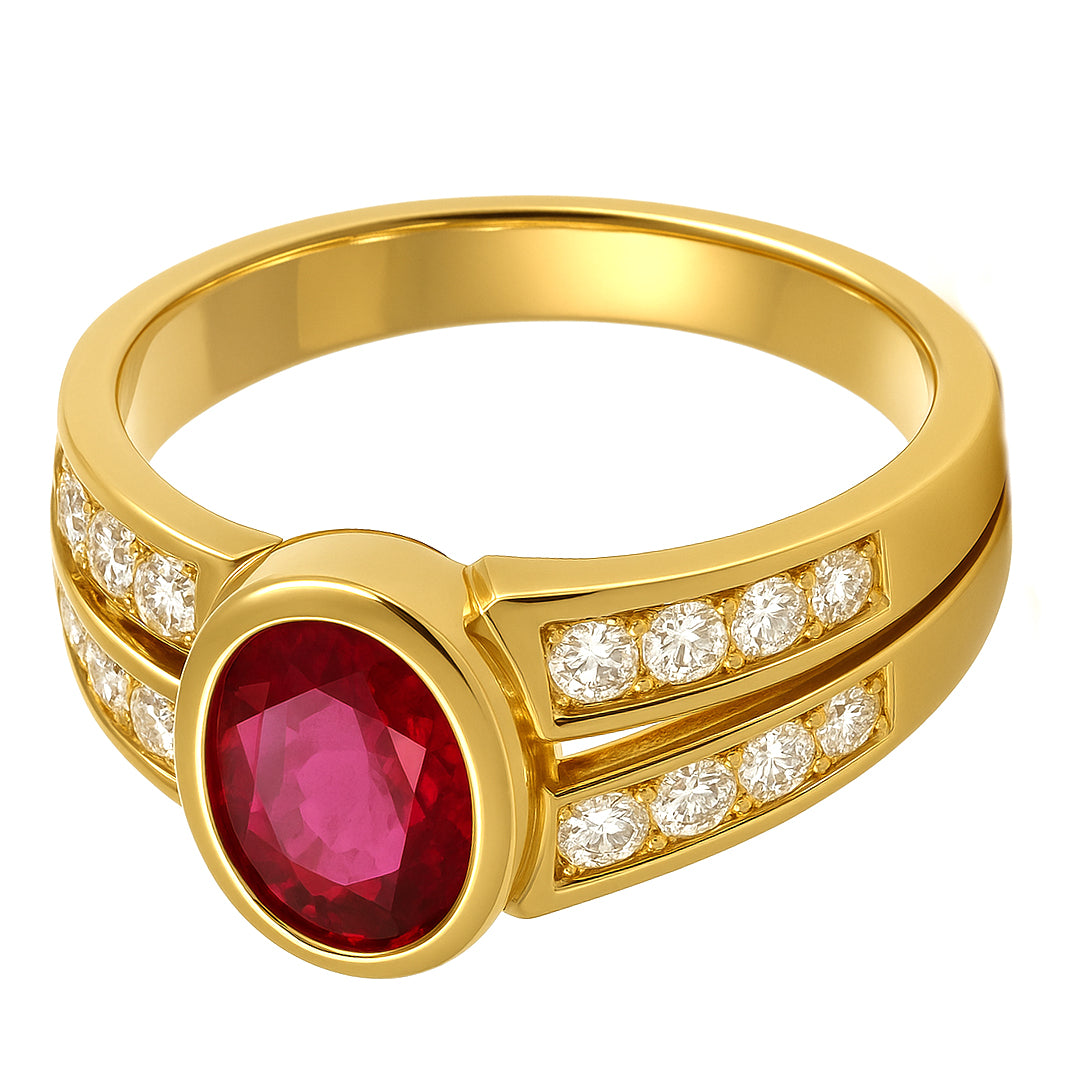 Anello in Oro giallo 18 carati con n 1 Rubino da 1.00 Ct e n 16 Diamanti 0.50 Ct tot
