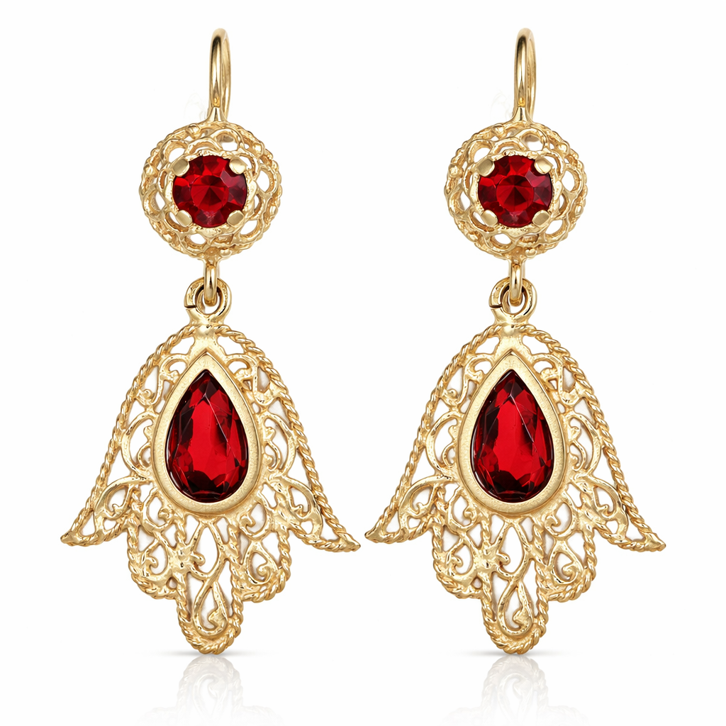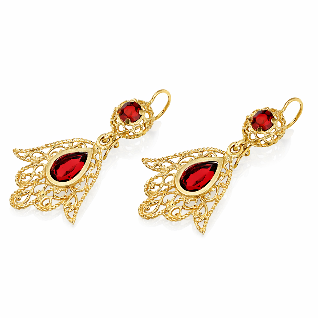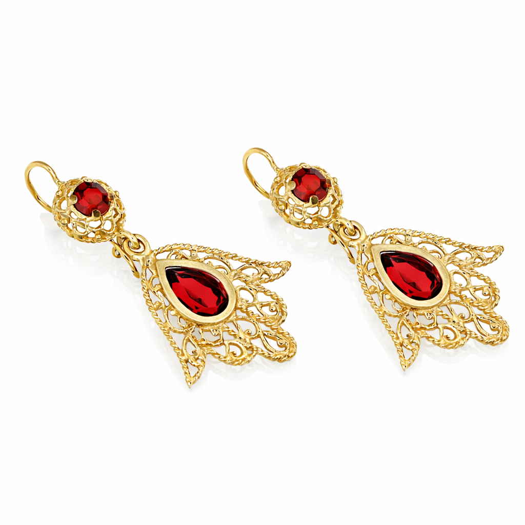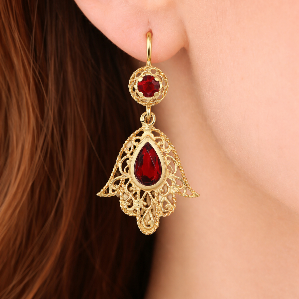 Coppia di orecchini pendenti da donna in oro giallo 18 carati con granati naturali, caratterizzati da una lavorazione traforata dal gusto ornamentale e da un design ricco di movimento. La struttura presenta un elemento superiore con granato rotondo e una parte pendente con granato a goccia, inseriti in una montatura elegante e decorativa. Un gioiello femminile e distintivo, ideale per chi cerca orecchini in oro dal forte impatto visivo e dallo stile raffinato.
