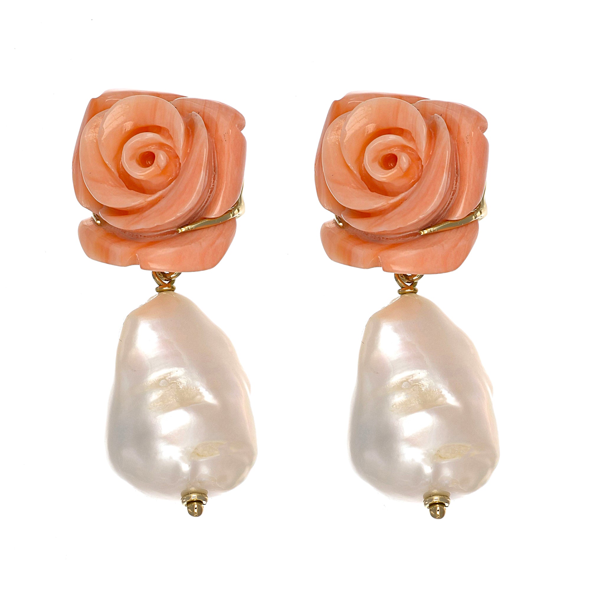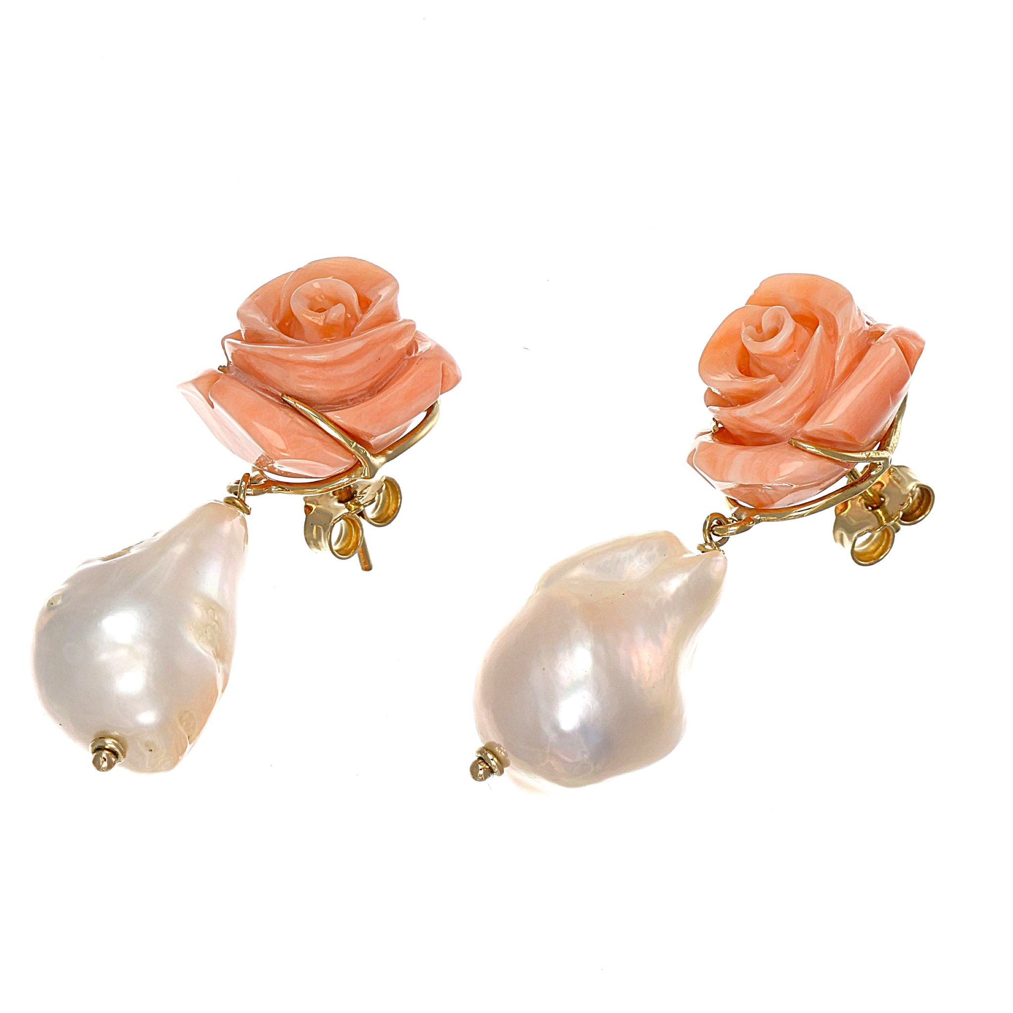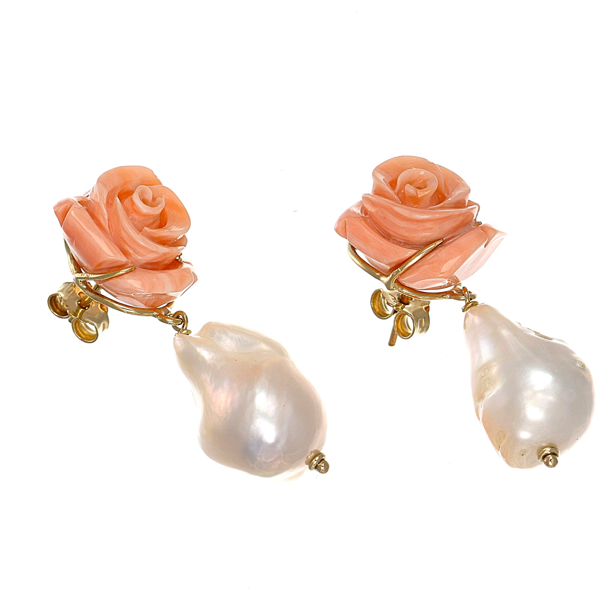Orecchini in oro giallo 18 carati con n 2 Corallo rosa da 16.20 mm e n 2 perle scaramazze
