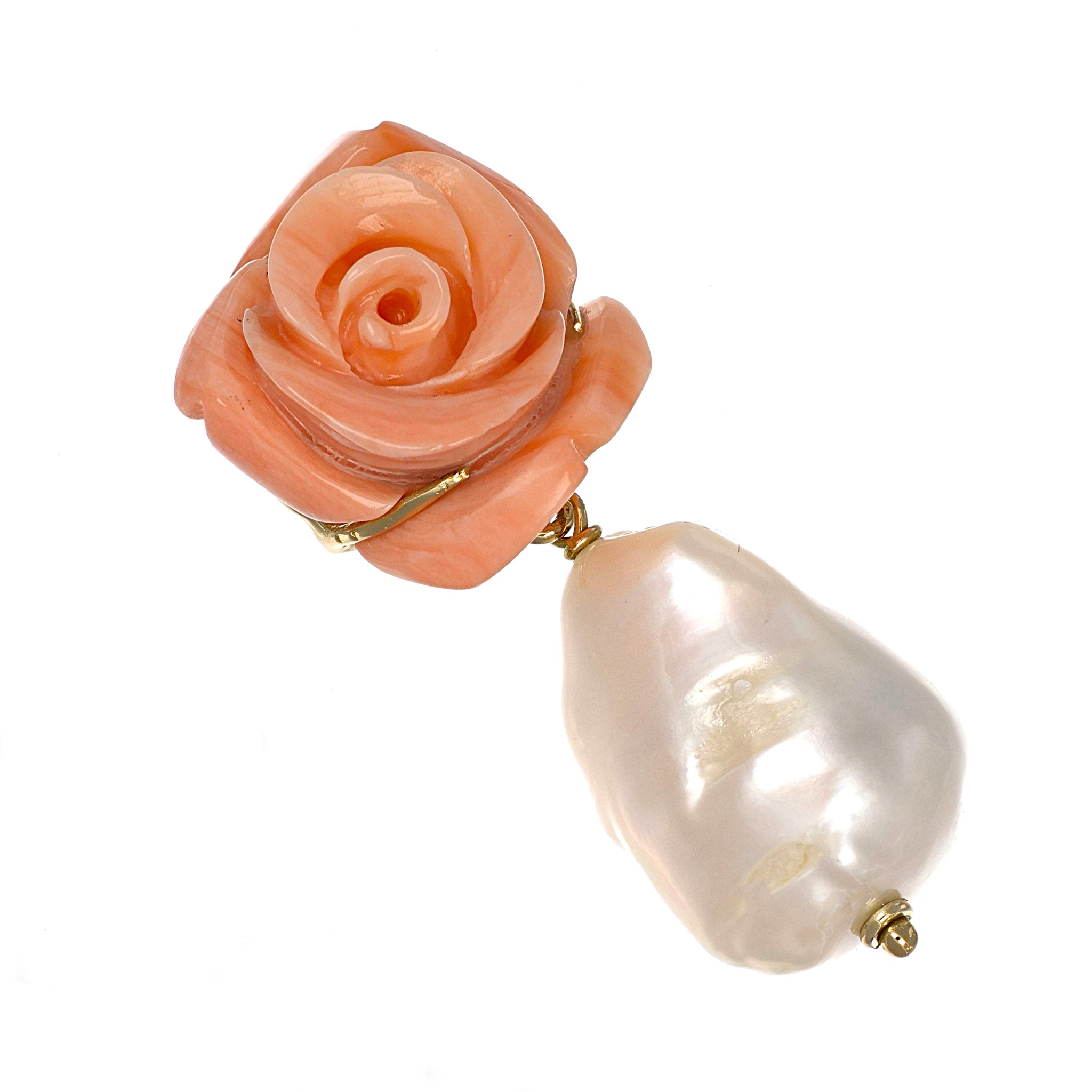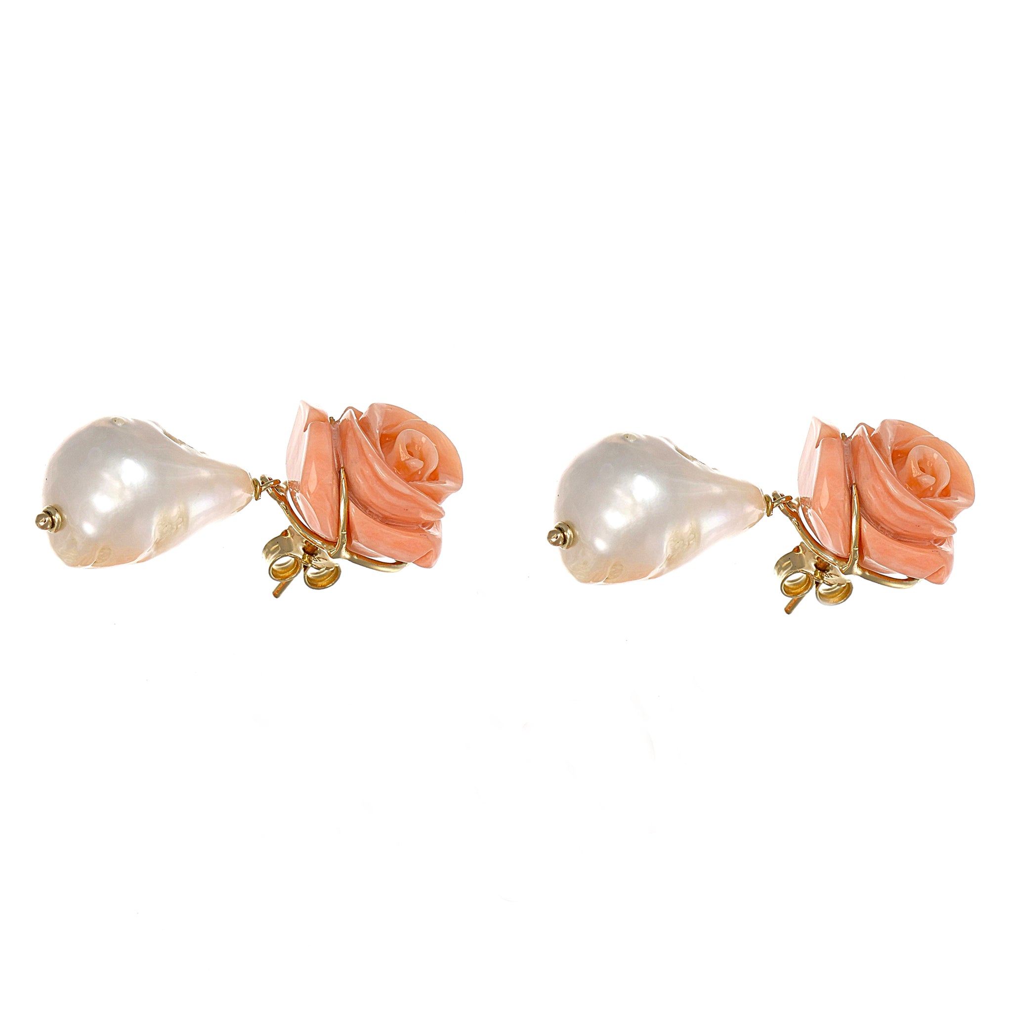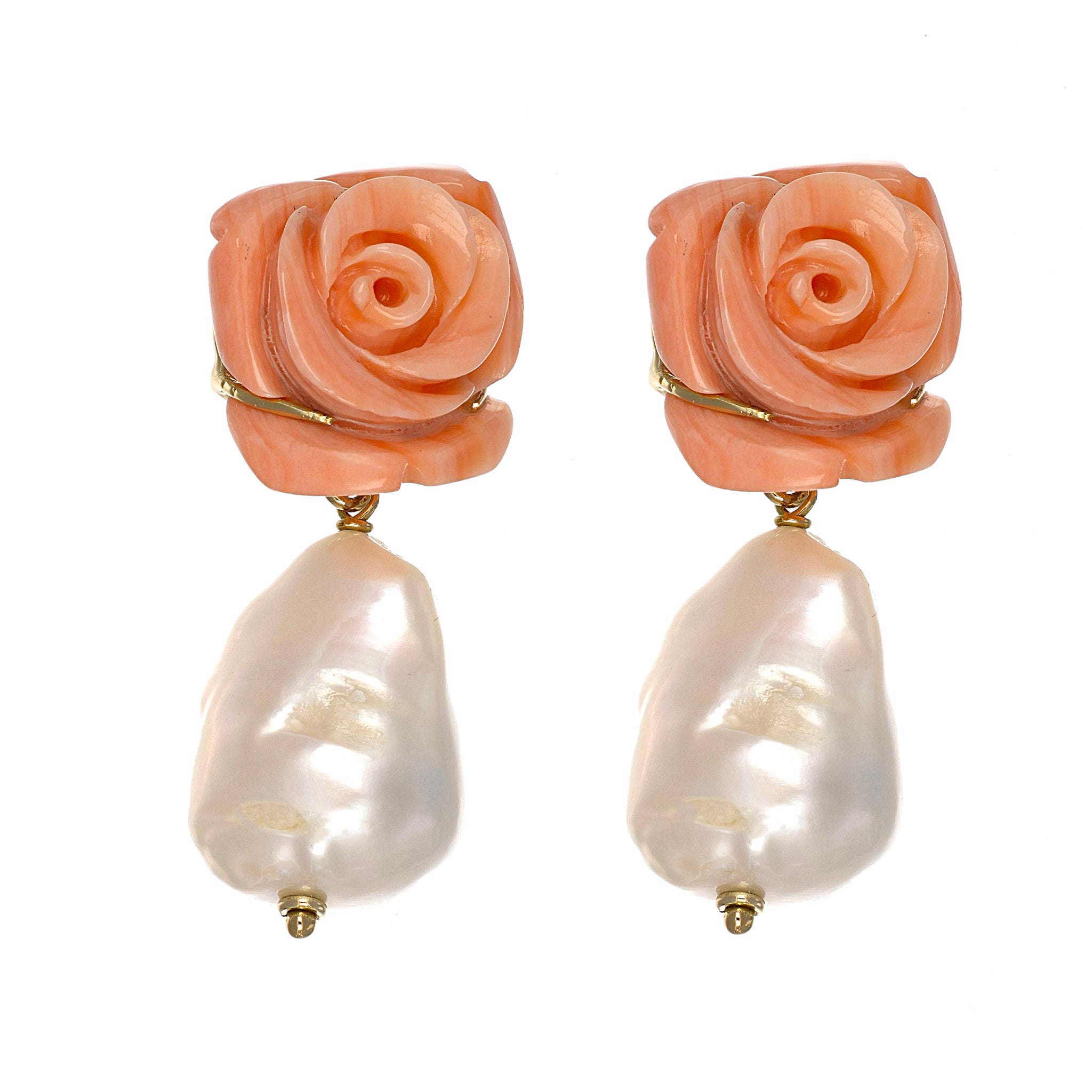 Orecchini in oro giallo 18 carati con n 2 Corallo rosa da 16.20 mm e n 2 perle scaramazze