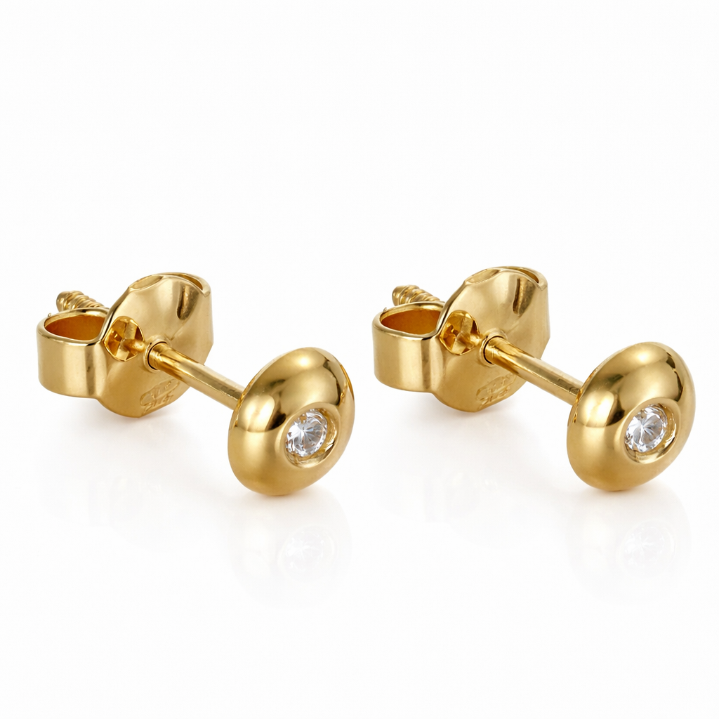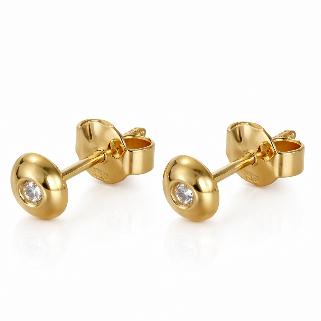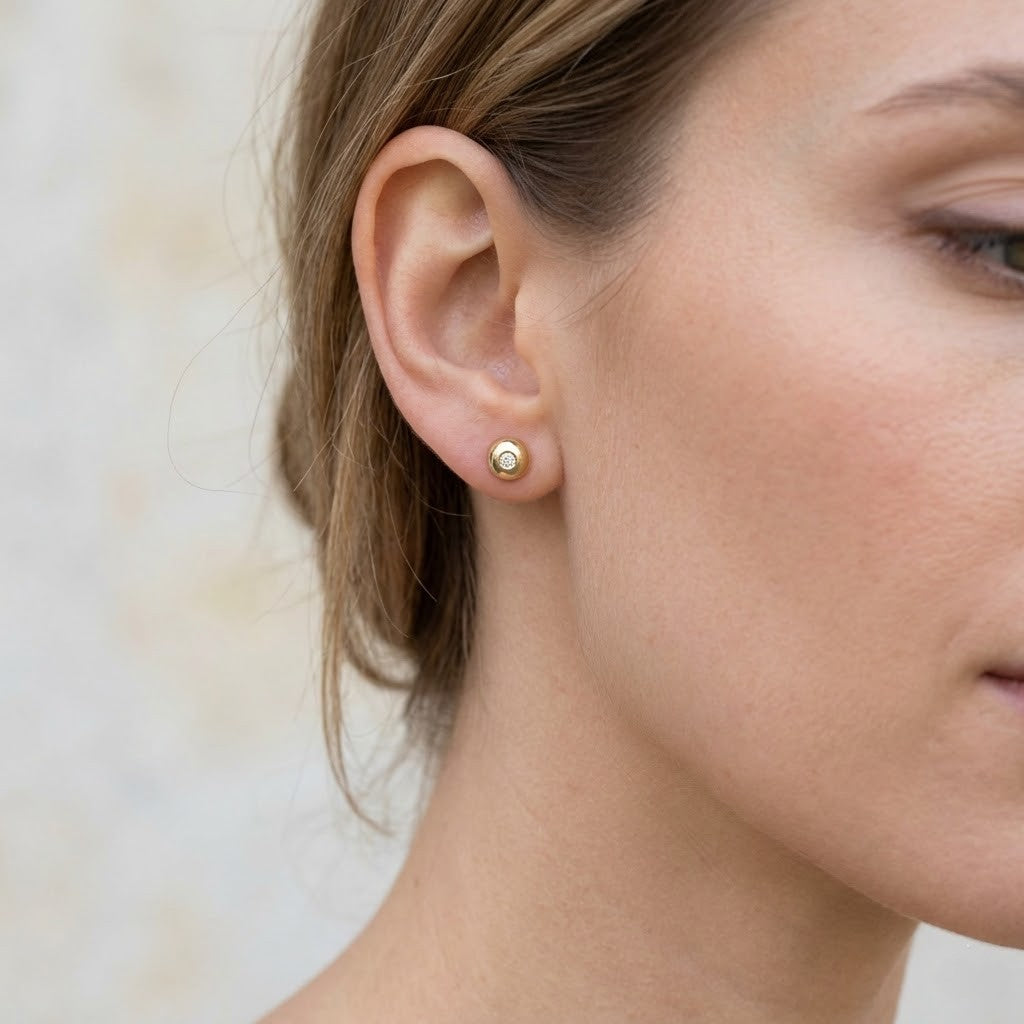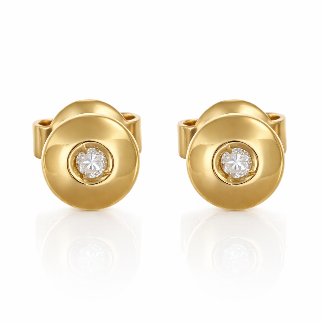 Coppia di orecchini da donna in oro giallo 18 carati con diamanti naturali incastonati al centro di una montatura bombata e compatta. Il design essenziale e contemporaneo valorizza la luminosità delle pietre e dona all’insieme un aspetto elegante, sobrio e versatile. Un gioiello raffinato, facile da indossare ogni giorno e perfetto per completare con discrezione qualsiasi stile.