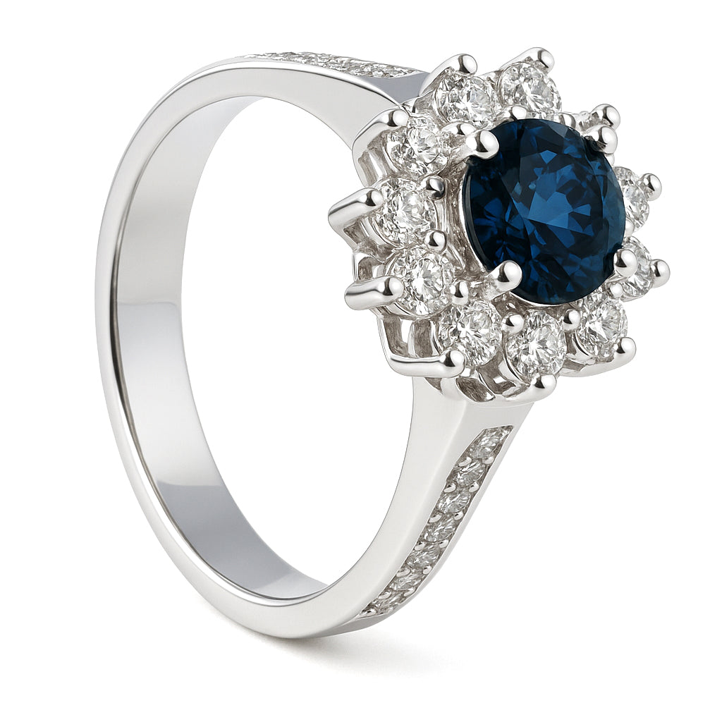 Anello in oro bianco 18 carati con n 1 Zaffiro da 0.50 Ct e n 20 Diamanti da 0.30 Ct tot
