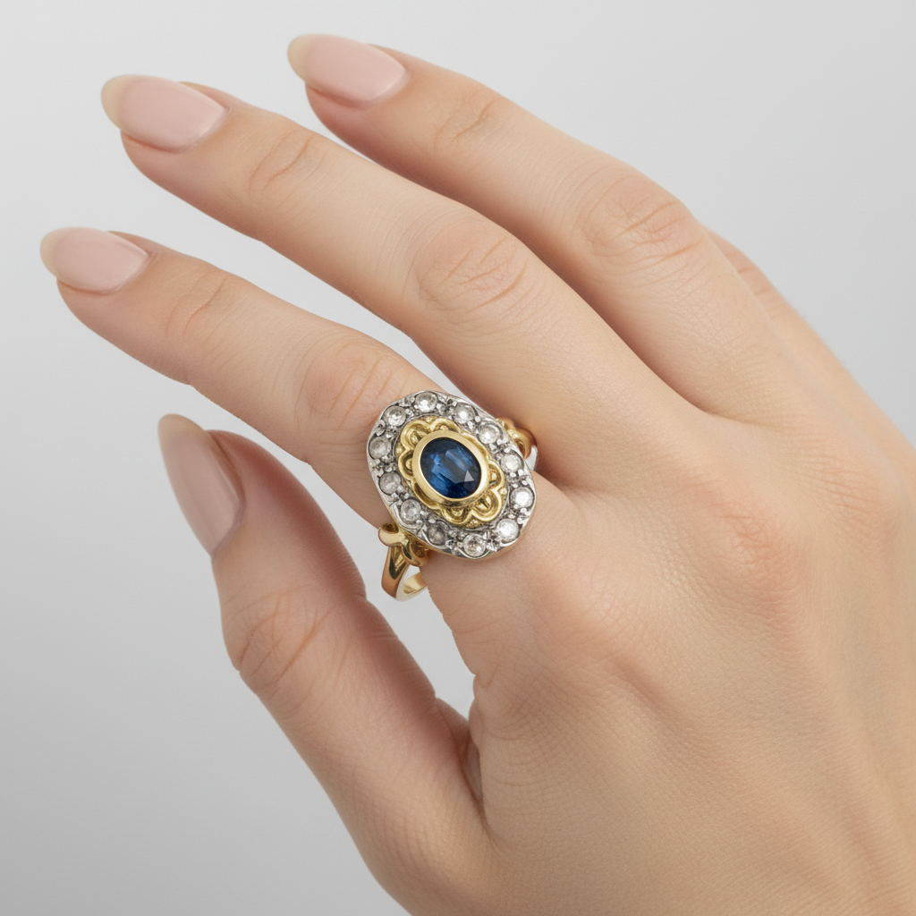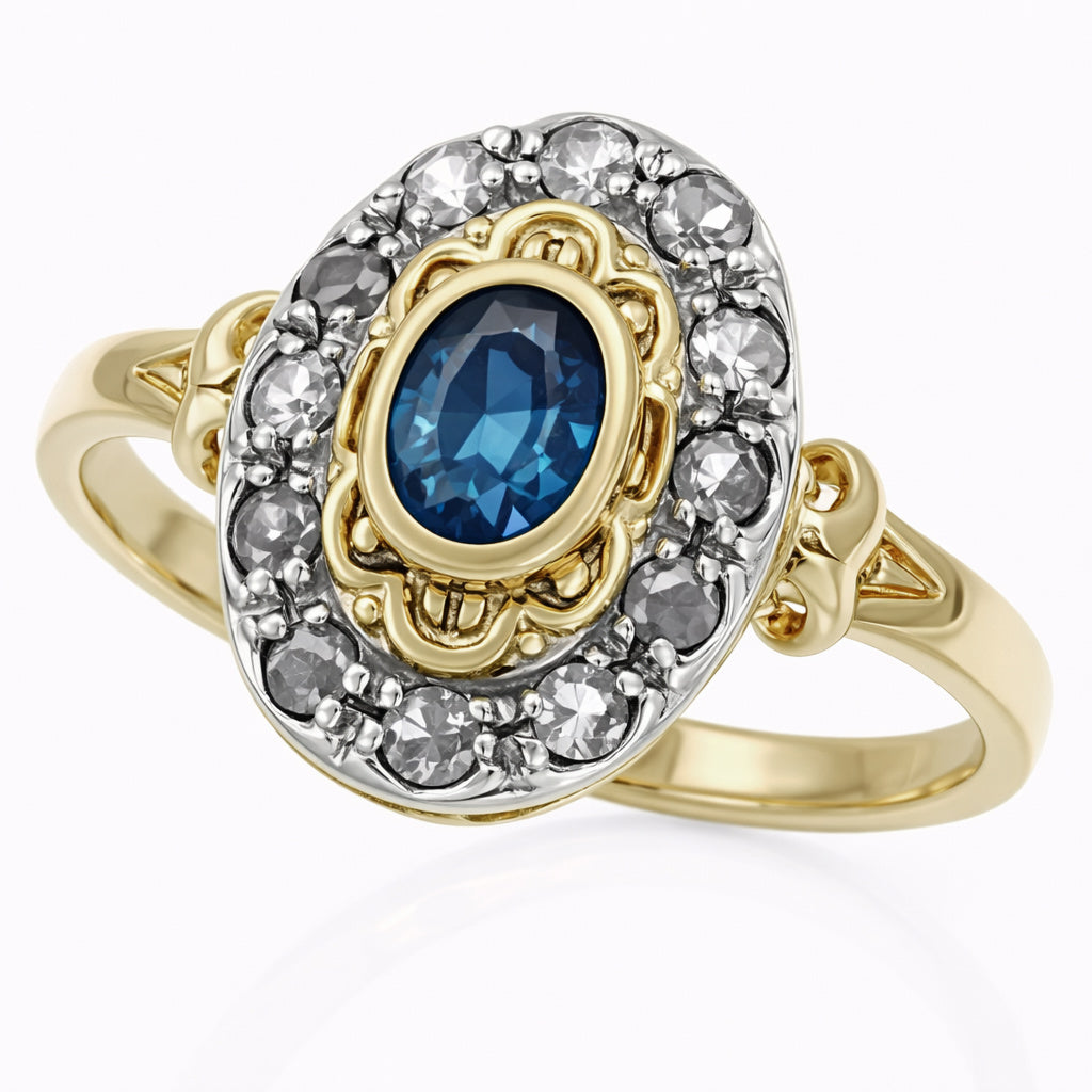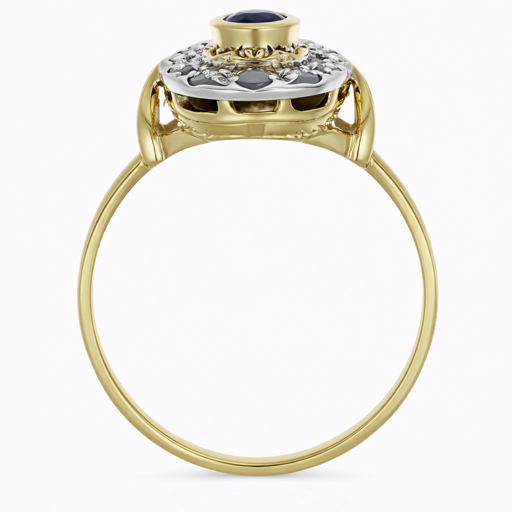 Anello in Oro giallo 18 carati e Argento 800 con n 1 Zaffiro da 0.25 Ct e n 12 Diamanti da 0.30 Ct tot