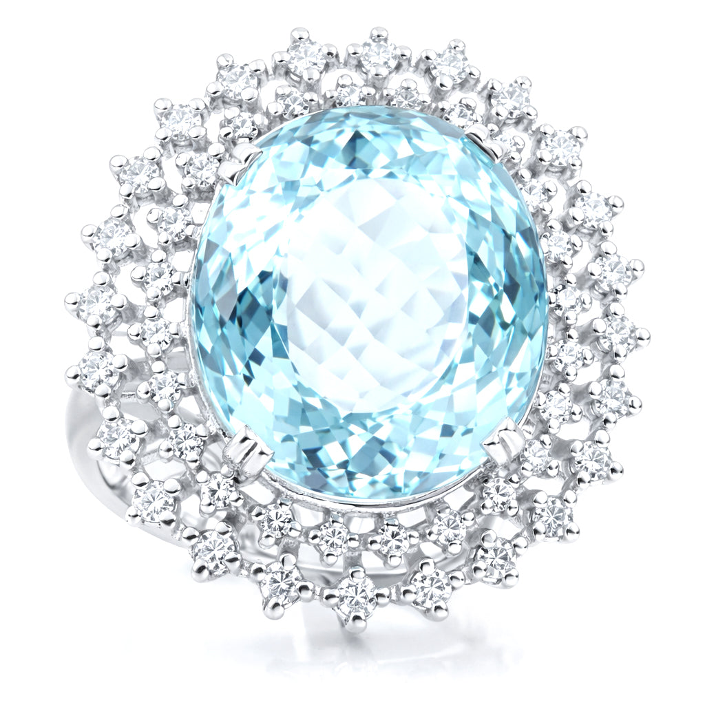 Anello in oro bianco 18 carati con n 1 Acquamarina da 15.50 Ct e n 48 Diamanti da 0.72 Ct tot