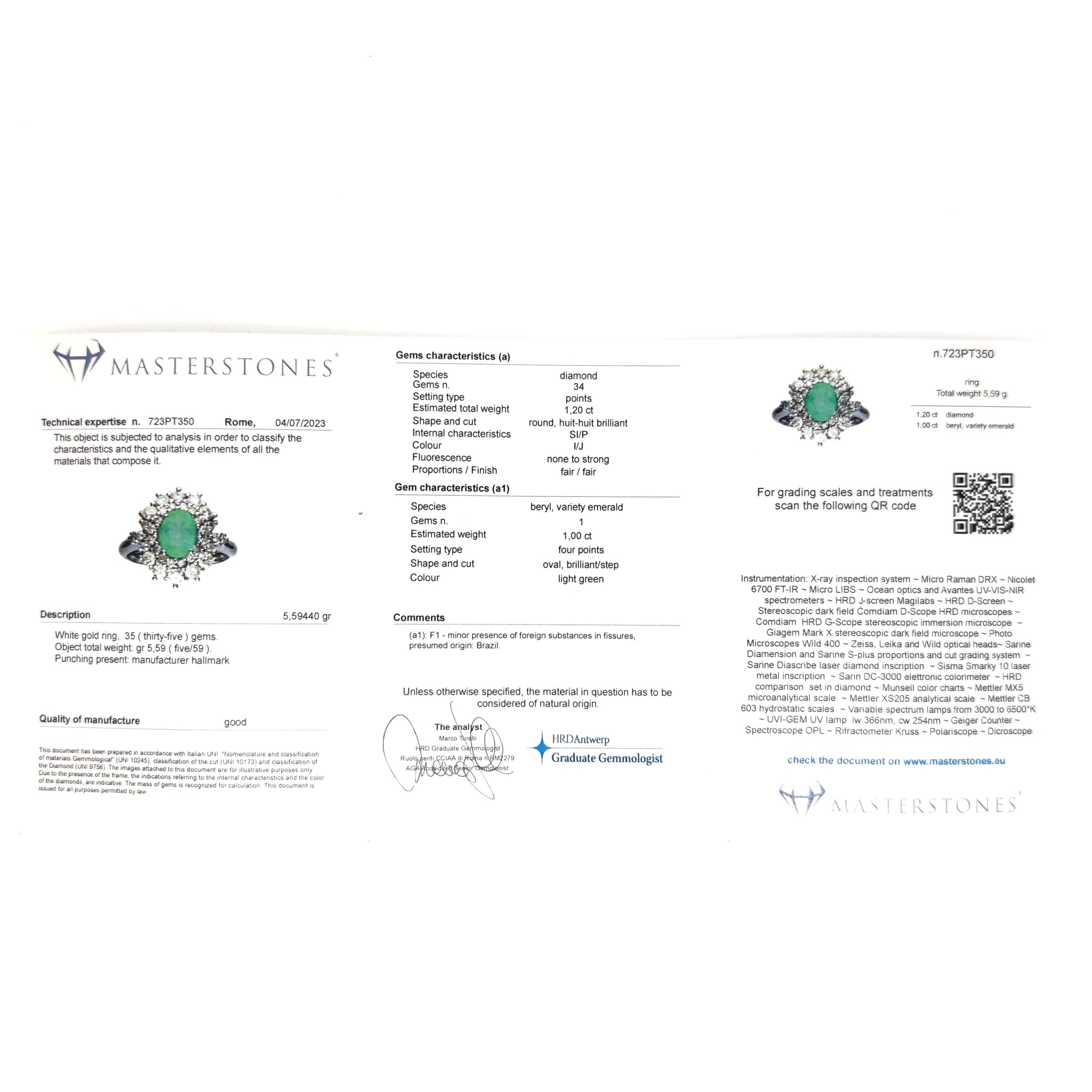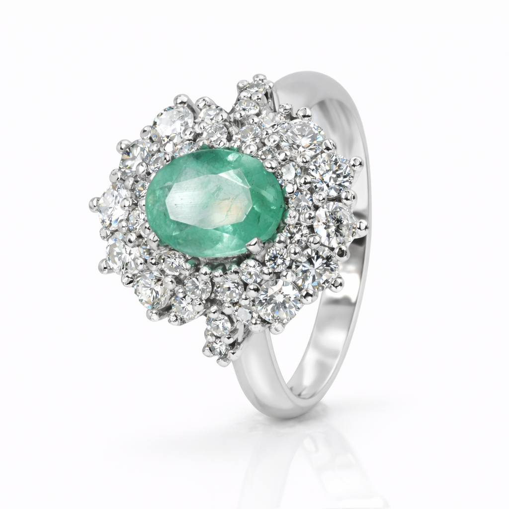Anello in oro bianco 18 carati con n 1 Smeraldo da 1.00 Ct e n 34 Diamanti da 1.20 Ct tot