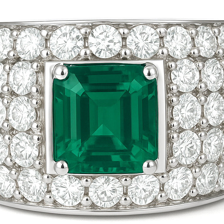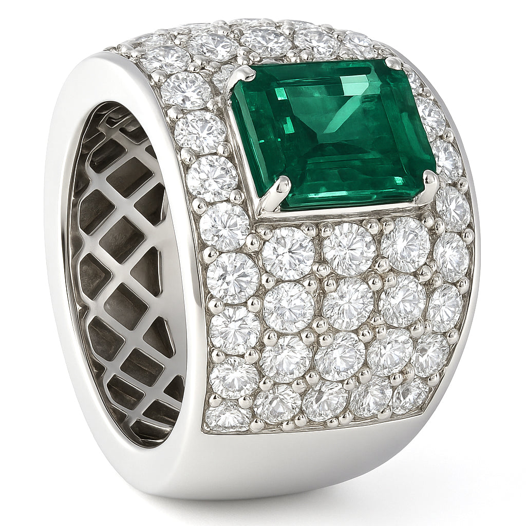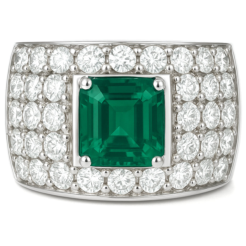 Anello in oro Bianco 18 carati con n 1 Smeraldo da 3.00 Ct e n 60 Diamanti da 3.50 Ct tot