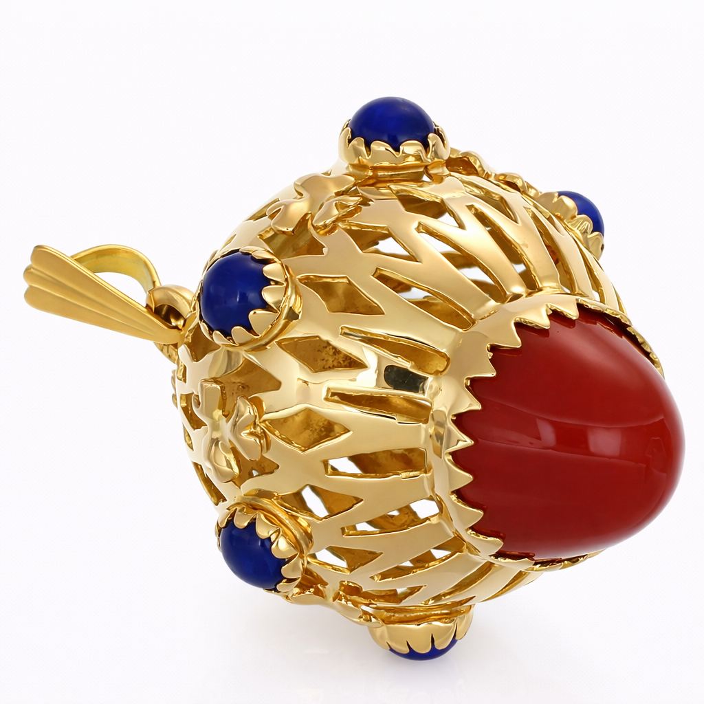 Ciondolo in Oro giallo 18 carati con n 1 Corallo da 4.75 Ct e n 6 Lapislazzulo da 1.20 Ct tot