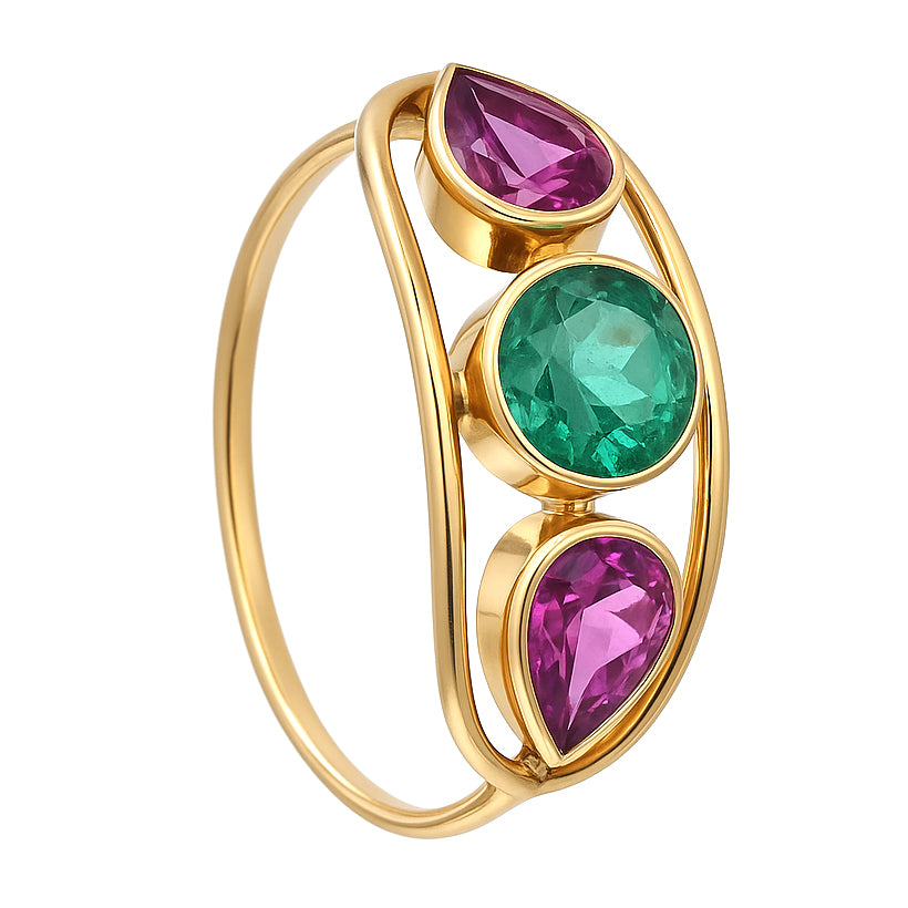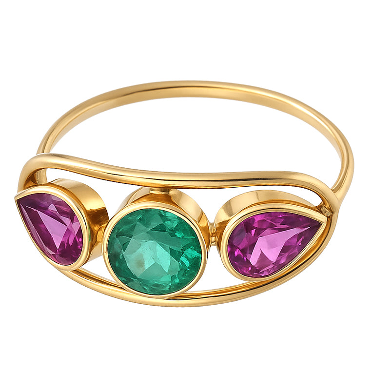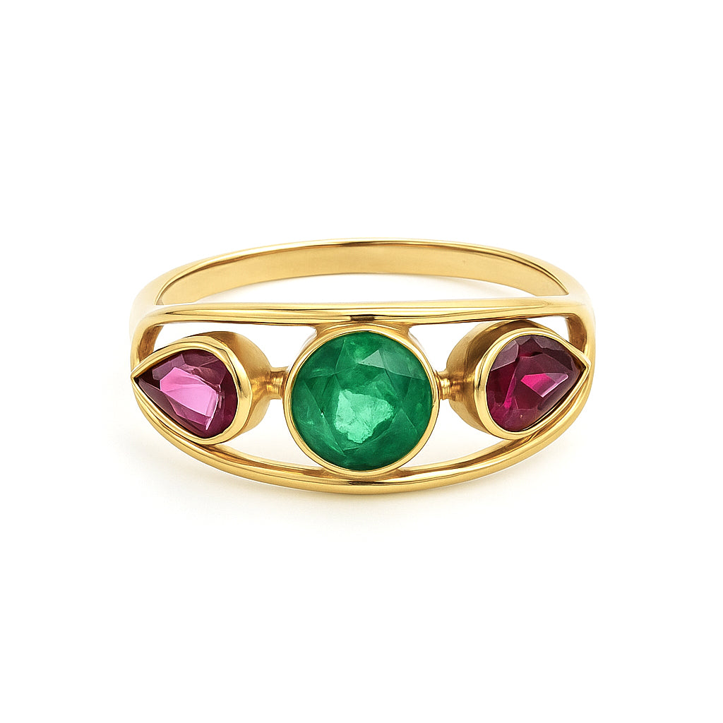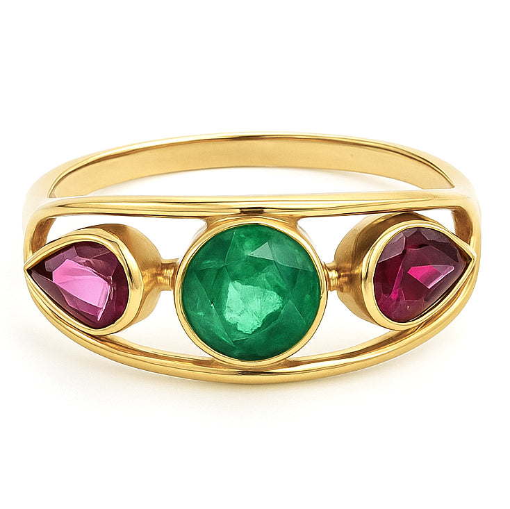 Anello in Oro giallo 18 carati con n 1 Smeraldo da 0.50 Ct e n 2 Rubini da 0.50 Ct tot