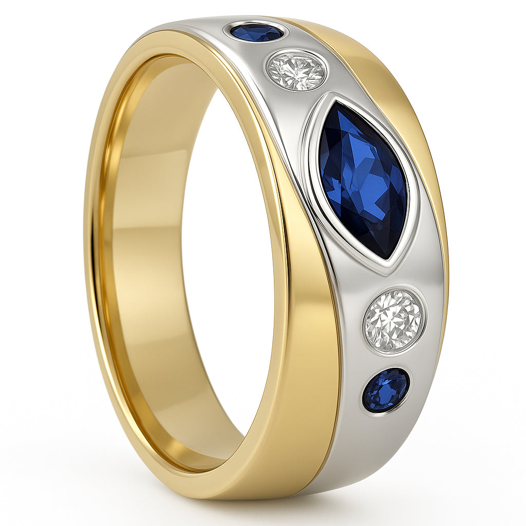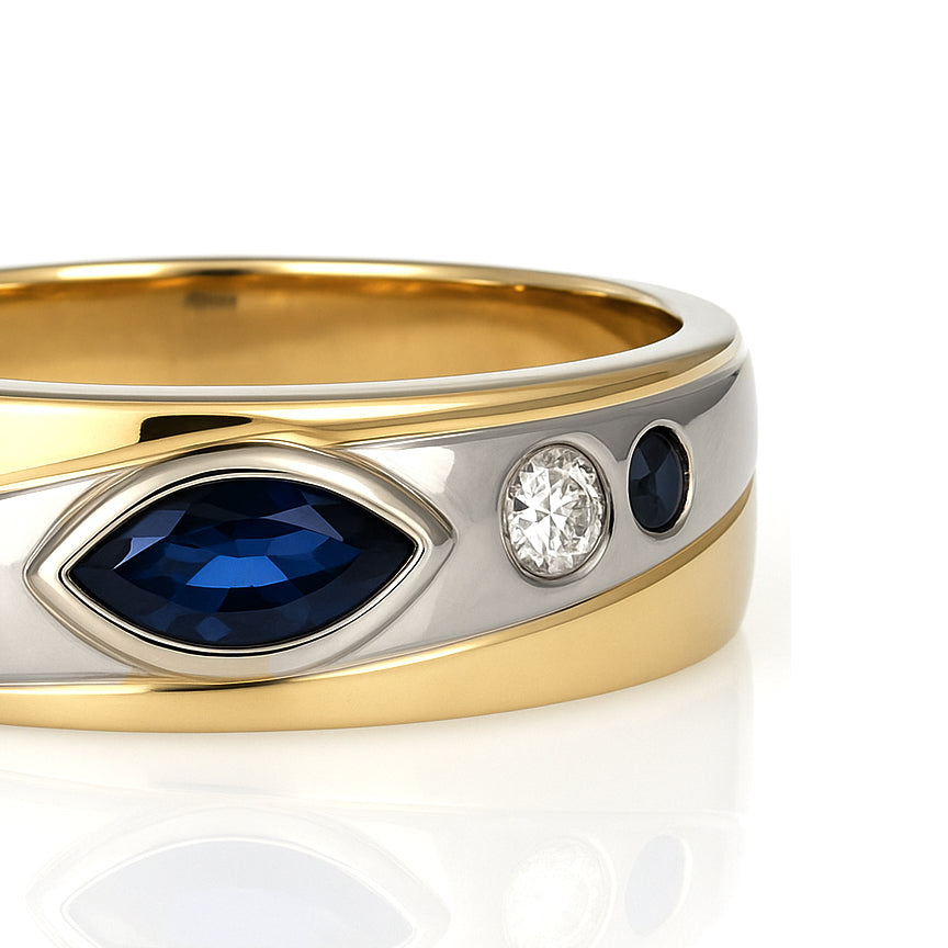 Anello in Oro giallo, Oro bianco 18 carati con n 3 Zaffiri da 0.42 Ct tot e n 2 Diamanti 0.07 Ct tot
