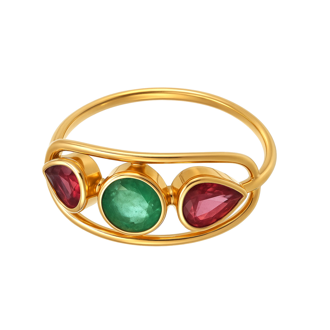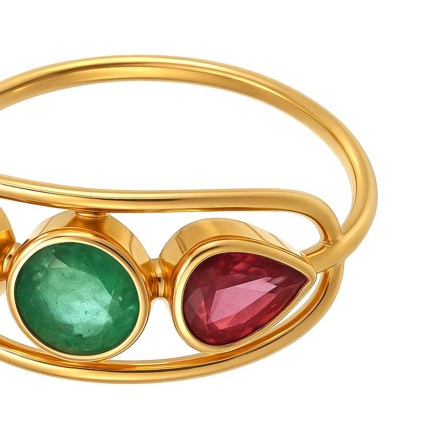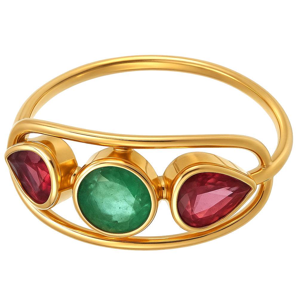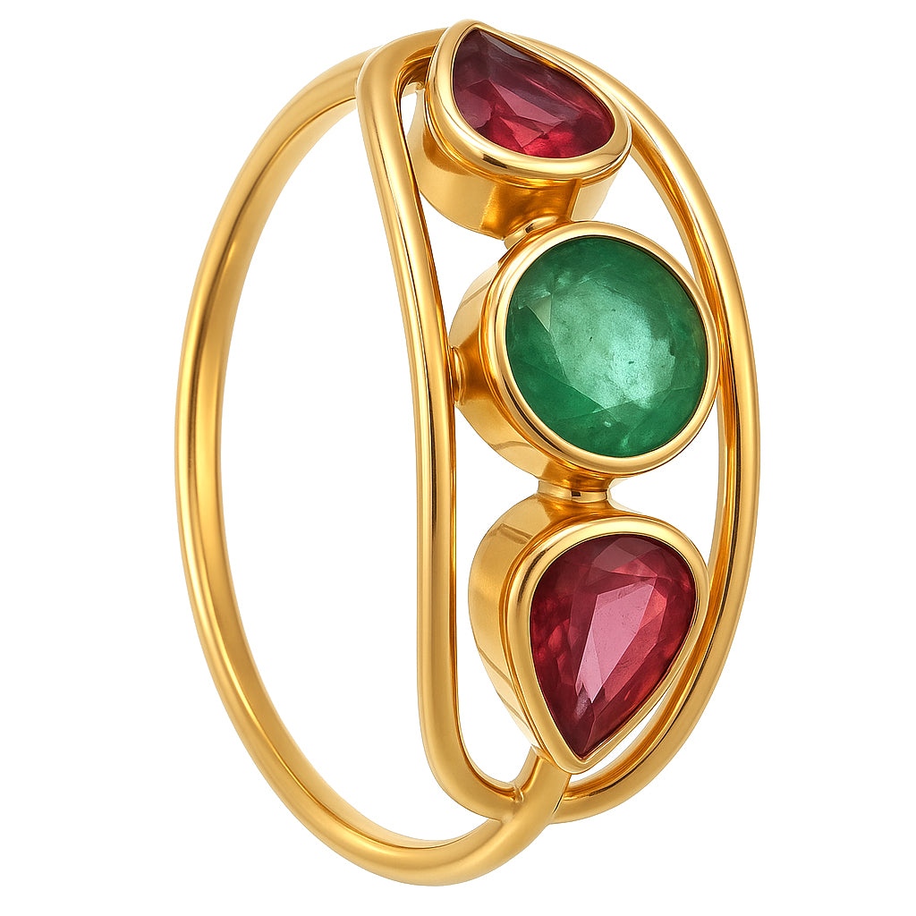 Anello in Oro giallo 18 carati con n 1 Smeraldo da 0.50 Ct e n 2 Rubini da 0.50 Ct tot