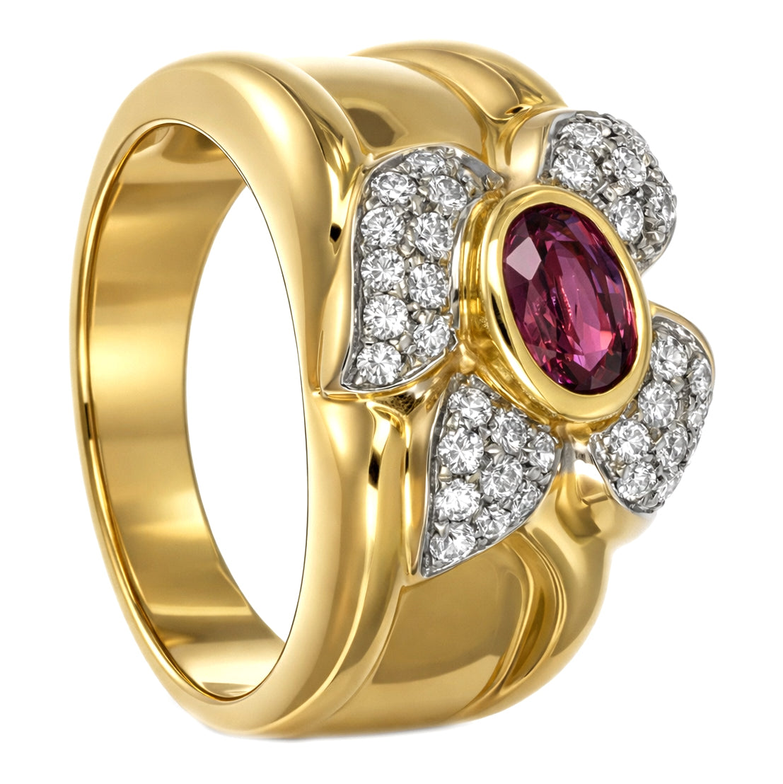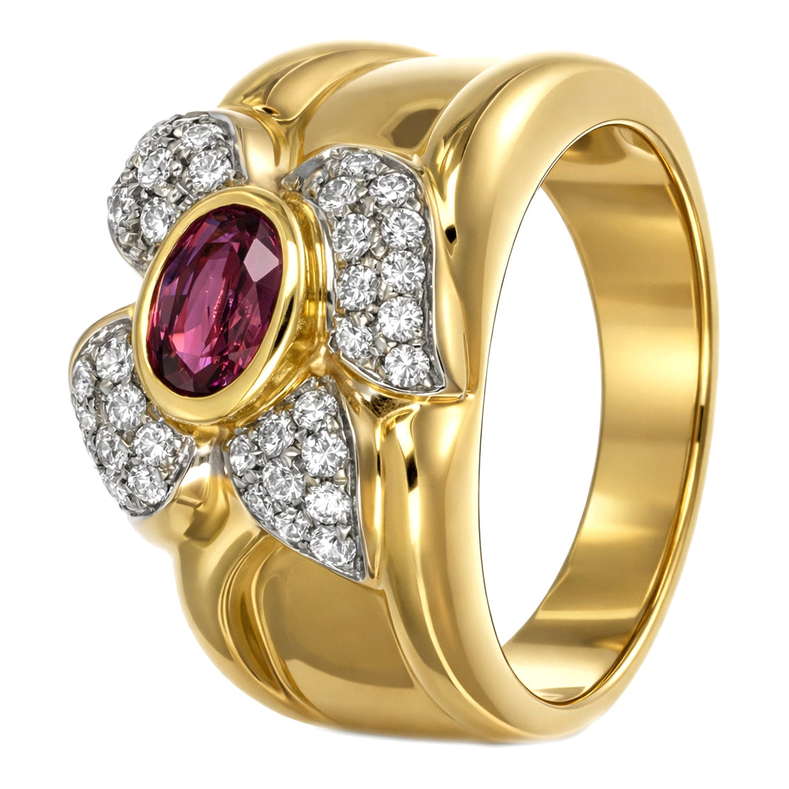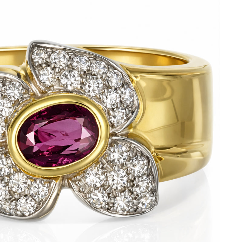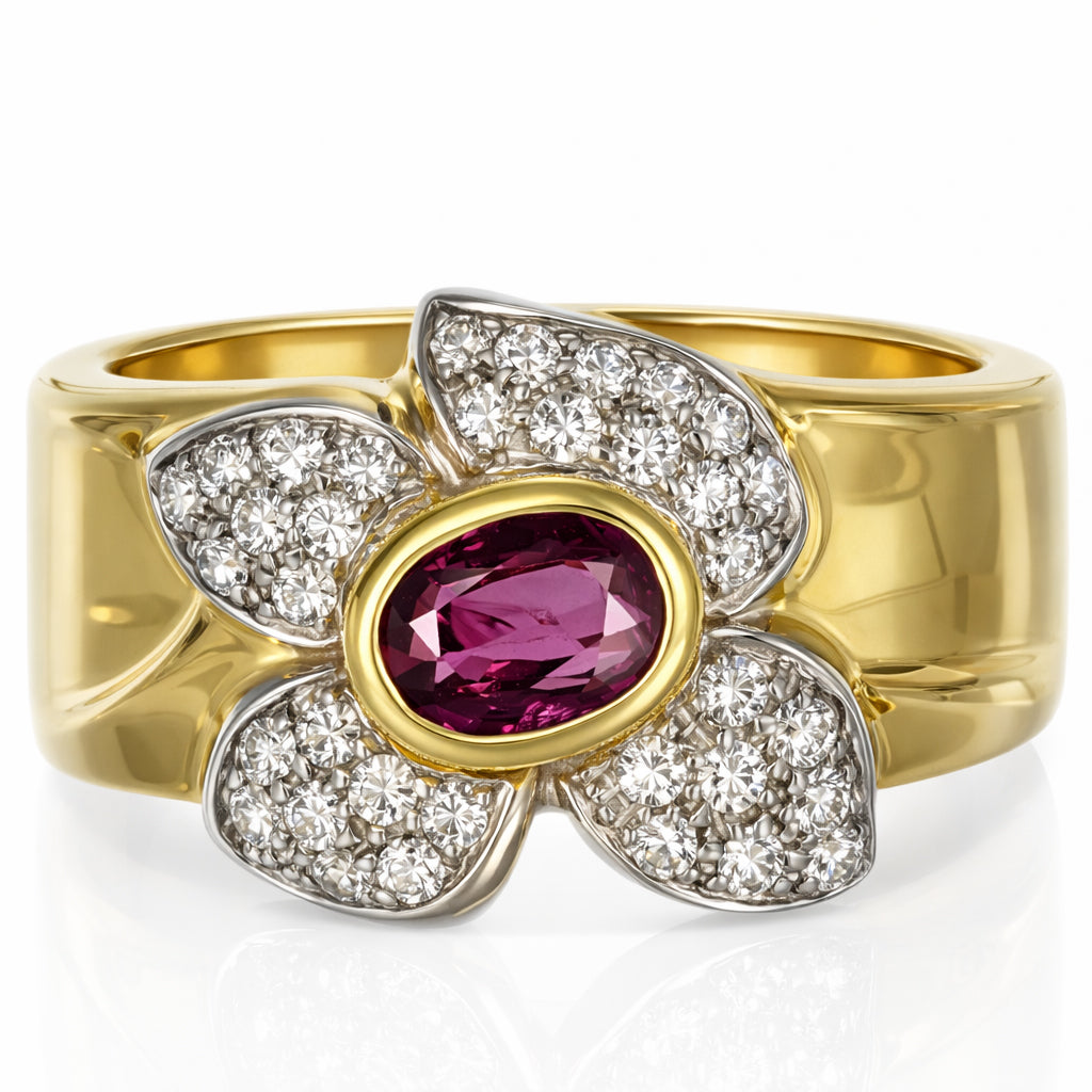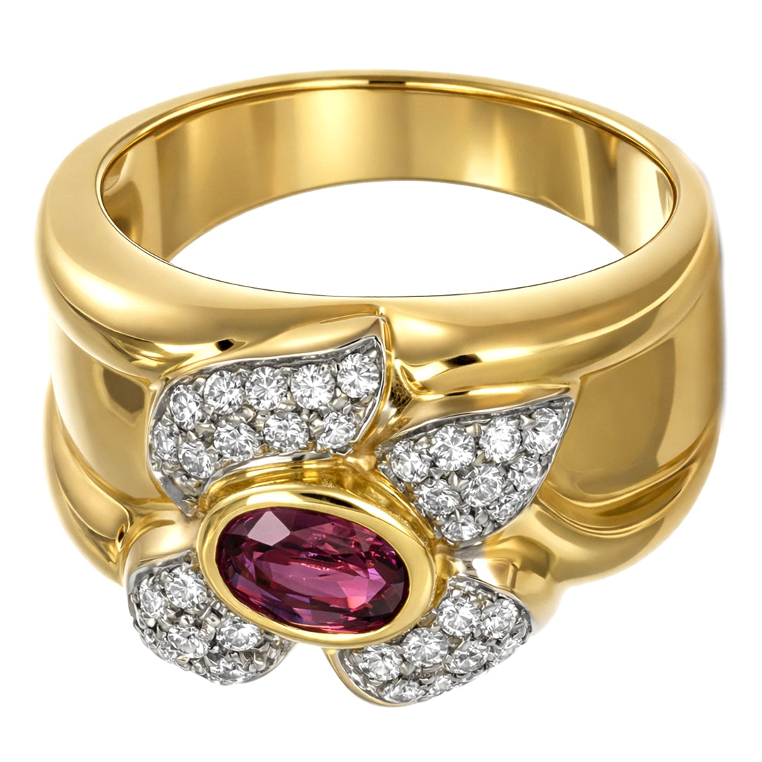 Anello in Oro giallo, Oro bianco 18 carati con n 1 Rubino da 0.70 Ct e n 37 Diamanti da 0.50 Ct tot