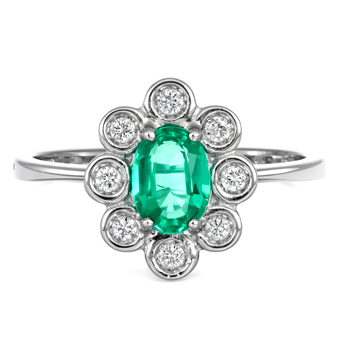 Anello in oro bianco 18 carati con n 1 Smeraldo da 0,72 Ct e n 8 Diamanti da 0.145 Ct tot